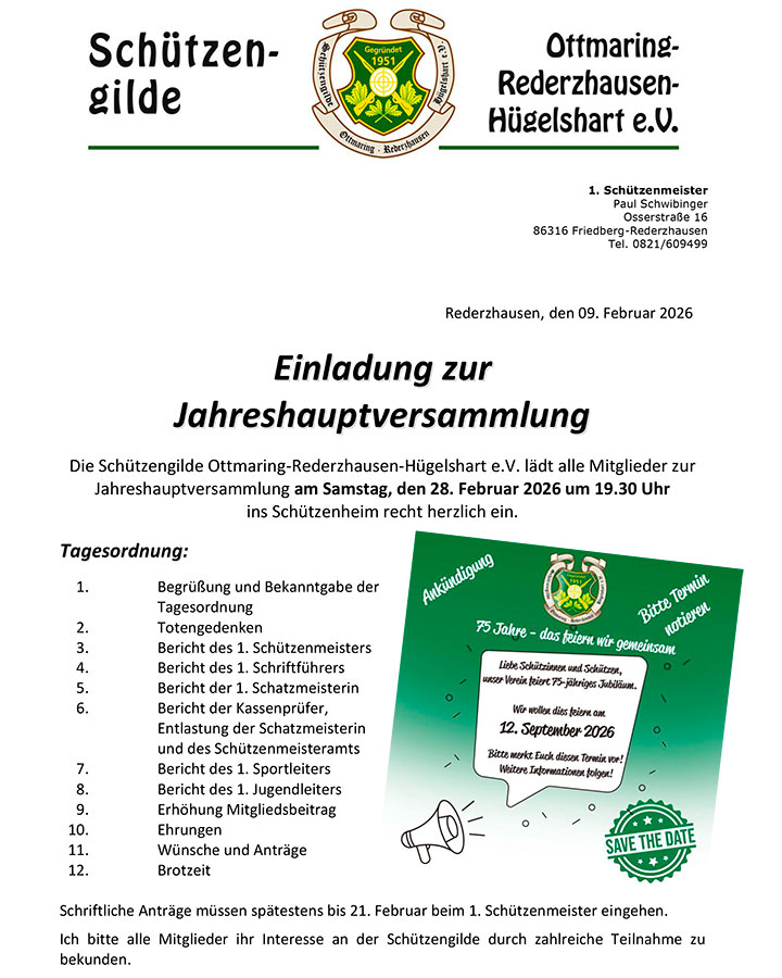 Die Schützengilde Ottmaring-Rederzhausen-Hügelshart e.V. lädt alle Mitglieder zur Jahreshauptversammlung am Samstag, den 28. Februar 2026 um 19.30...